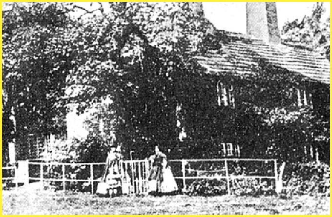 (left) with Miss Louisa Ann Easther; in the background is the Schoolhouse and